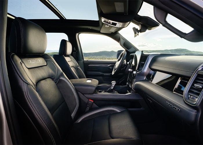 Inside the cabin, the Ram 1500 and Ram 2500 are both available with seating for up to six people, work-grade vinyl upholstery, and plenty of interior storage pockets. Both models are also available with remote start functionality, leather upholstery, and heated and ventilated front seats for year-round comfort. However, the Ram 1500 Tungsten takes luxury to new heights with 24-way power-adjustable front seats with massage functionality and reclining rear seats that provide best-in-class legroom.
