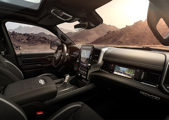 From connecting with clients to staying informed behind the wheel, the Ram 1500 and Ram 2500 offer a standard 8.4-inch Uconnect® 5 infotainment screen with Apple CarPlay® and Android Auto™ connectivity or an available 12.0-inch Uconnect® 5 NAV infotainment screen and a 12.0-inch Digital Cluster Display. In addition, both models offer a 14.5-inch touchscreen display as well as an advanced 10.25-inch Front Passenger Interactive Display. Providing incredible audio playback, the Ram 2500 is available with up to a 17-speaker Harman Kardon® premium audio system, while the Ram 1500 pushes your listening experience to new heights with an available 23-speaker Klipsch® Reference Premiere Audio System.